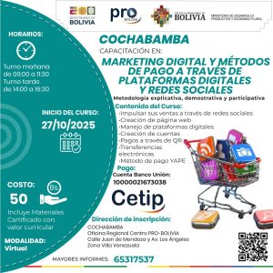 PRO-BOLIVIA, entidad desconcentrada del Ministerio de Desarrollo Productivo y Economía Plural a través de los programas CETIP y PROMYPE Fase II, realiza capacitaciones y asistencia técnica a unidades productivas a nivel nacional en los rubros: alimentos, madera, cuero, textil y metalmecánica.
