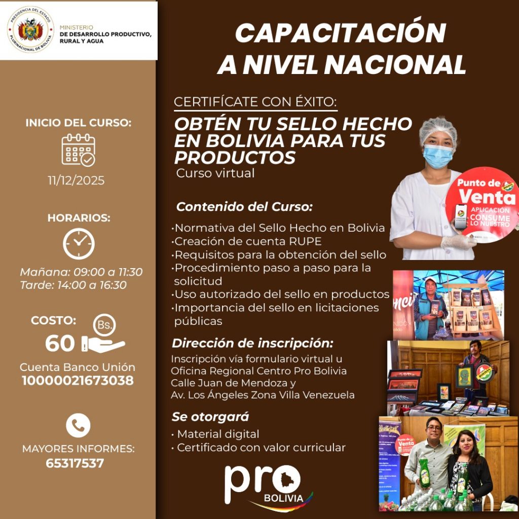 Cochabamba, 03 de diciembre de 2025 (PRO-BOLIVIA).- La entidad PRO-BOLIVIA invita a todas las Unidades productivas, emprendedores, artesanos y MyPE’s que requieran obtener el sello “Hecho en Bolivia” para tus productos, a inscribirse al curso que iniciará el 11 de diciembre de la presente gestión. La entidad mediante el Centro de Tecnología e Innovación Productiva […]