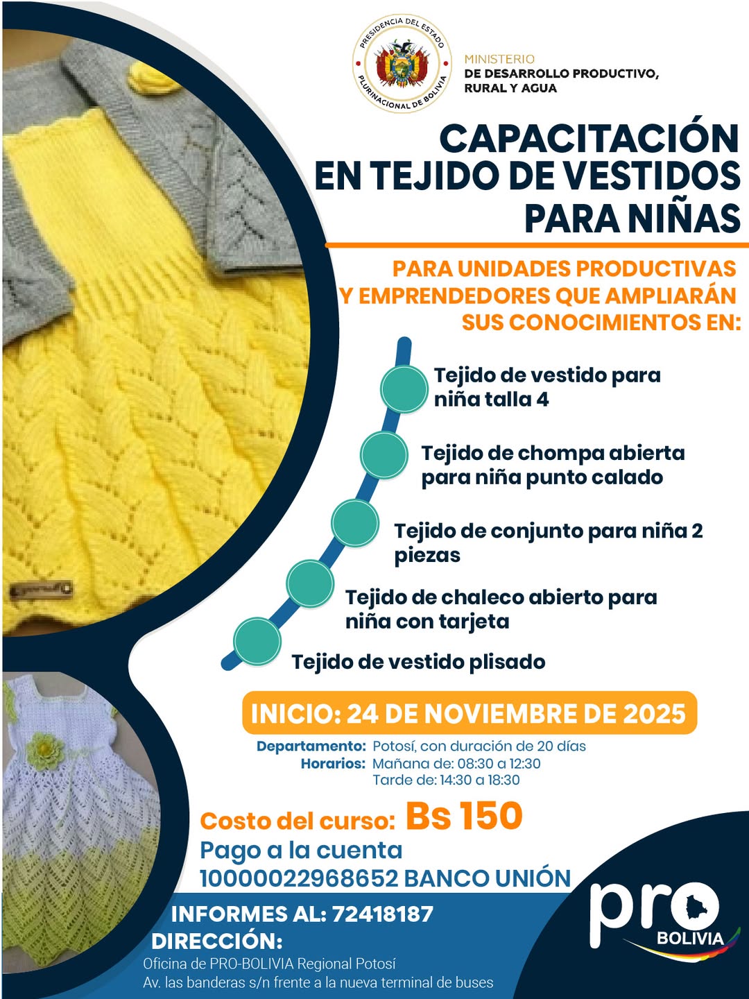 PRO-BOLIVIA inicia inscripciones para la capacitación en «Tejido de vestidos para niñas» en Potosí